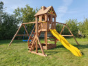 Детский городок Выше Всех Новая Победа 3 это обновлённая модель самого популярного городка, который выпускается с 2015г. и пользуется большой популярностью у наших покупателей. Новая Победа 3 отлично подойдет как для малышей, так и для детей постарше. Малыши могут поиграть в удобной песочнице. Для удобства обустроена лавочка, а для безопасности есть небольшой заборчик, который блокирует случайный выход ребенка из зоны песочницы в сторону качельной балки. Также малыши оценят качели-гнездо.