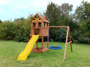 Детям постарше безусловно понравится яркая двухволновая горка со скатом 2.7 метра. А для культуристов предусмотрен уточйчивый модуль с металлическим турником.