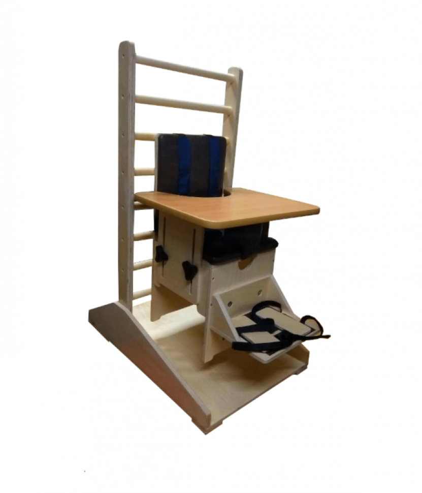 Опора для сидения и стояния – помогает создать правильное симметричное положение ребенка и удерживать равновесие с помощью набедренного и нагрудного креплений, абдуктора и регулируемых по высоте ножек (подножки) и подлокотников. Опора имеет столик для дополнительной опоры рук и развития мелкой моторики. В комплект входит лестница-стойка с перекладинами для удержания равновесия. Мягкие элементы на поролоне, обтянуты искусственной кожей. Изделие окрашено мебельным лаком. Первые два размера имеют крючки для крепления сидения к лестнице.