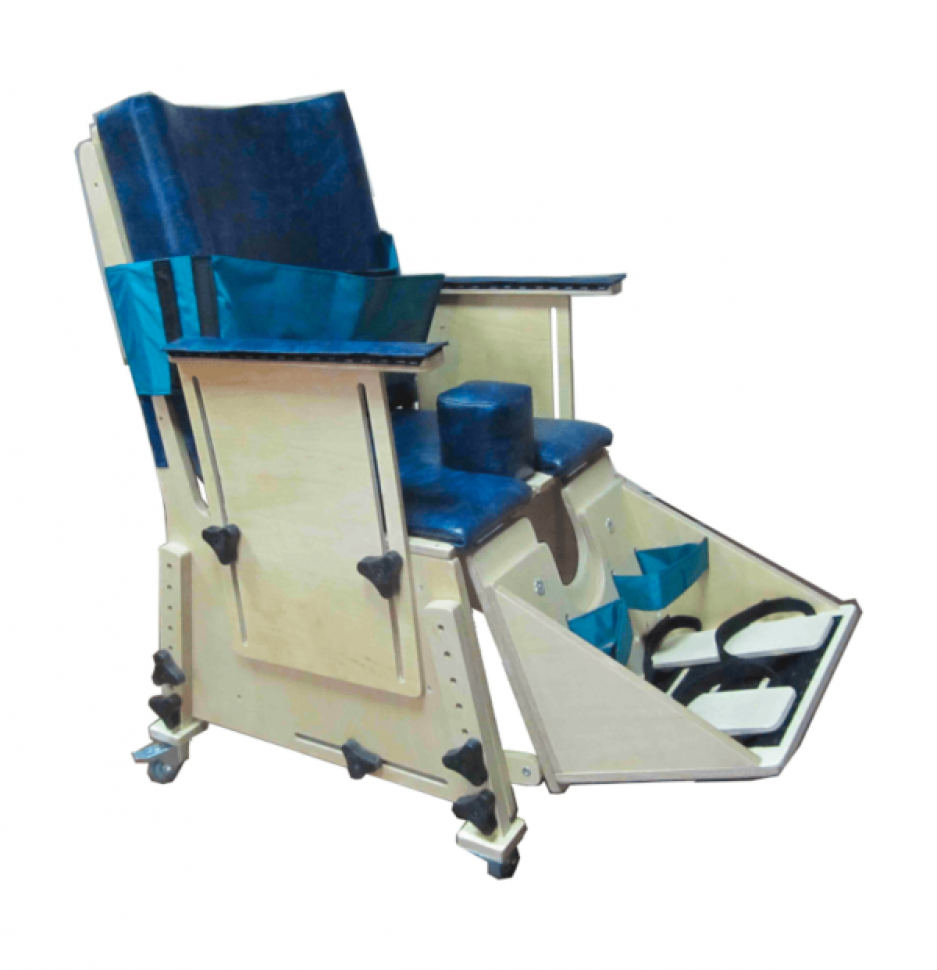 Опора для сидения с изменяемым углом наклона подножки и прямой спинкой до плеча необходима для пациентов с рекурвацией колена, что расслабляет мышцы и снижает спастику. Для устранения перекреста ног и для пассивной растяжки абдукционных мышц служит регулируемый и съемный абдуктор, предусмотрена фиксация стоп. Тазобедренная часть тела фиксируется набедренным креплением, а грудная — регулируемым креплением «жилетик». К сидению прилагается столик, прикрепляемый на липучках к подлокотникам. Ножки сидения и подлокотники регулируются по высоте. Опора установлена на колесах, задняя пара колес имеет тормоза. Мягкие элементы на поролоне, обтянуты искусственной кожей.